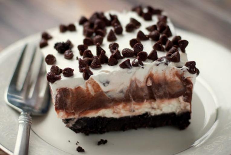 - Then, spread the rest of the cream cheese mixture over the pudding. Finally, sprinkle mini chocolate chips over the top of the dessert.