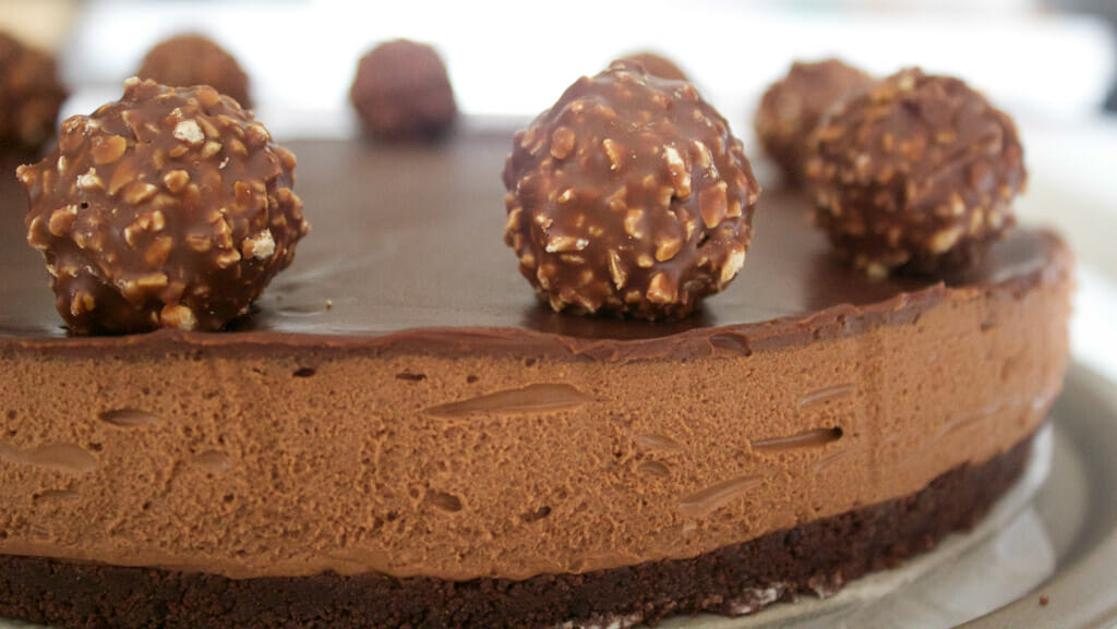 • Grease and line base of a spring form cake tin. Mix biscuit crumbs, butter, 8 Ferrero Rochers in a blender and whiz until you get smooth, wet crumb batter. Press the crumb mixture into the tin, and place in the fridge.